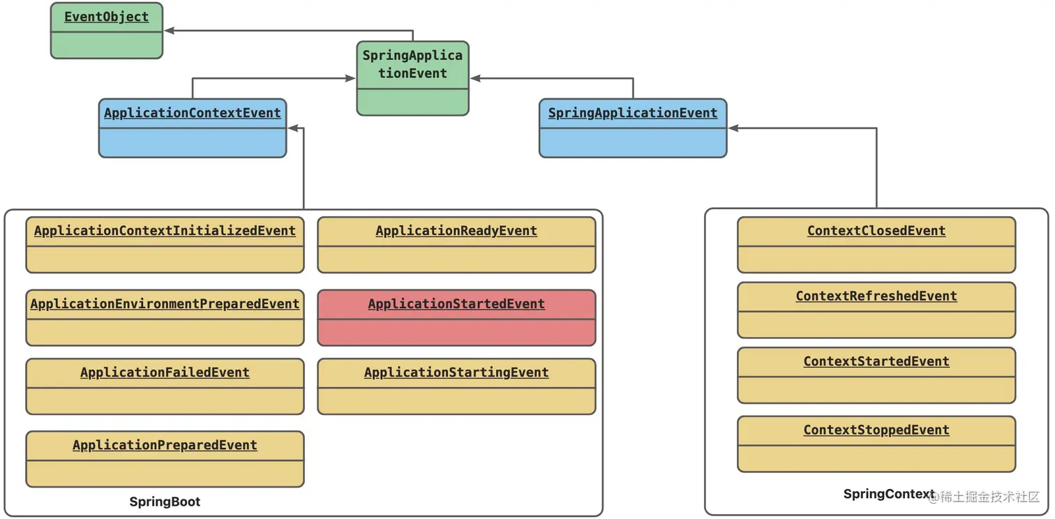 ApplicationEvent是spring系中事件的父类,该类同样继承了 java中的EventObject。ApplicationContextEvent是springContext的基础事件类。SpringApplicationEvent是springBoot的基础事件类。