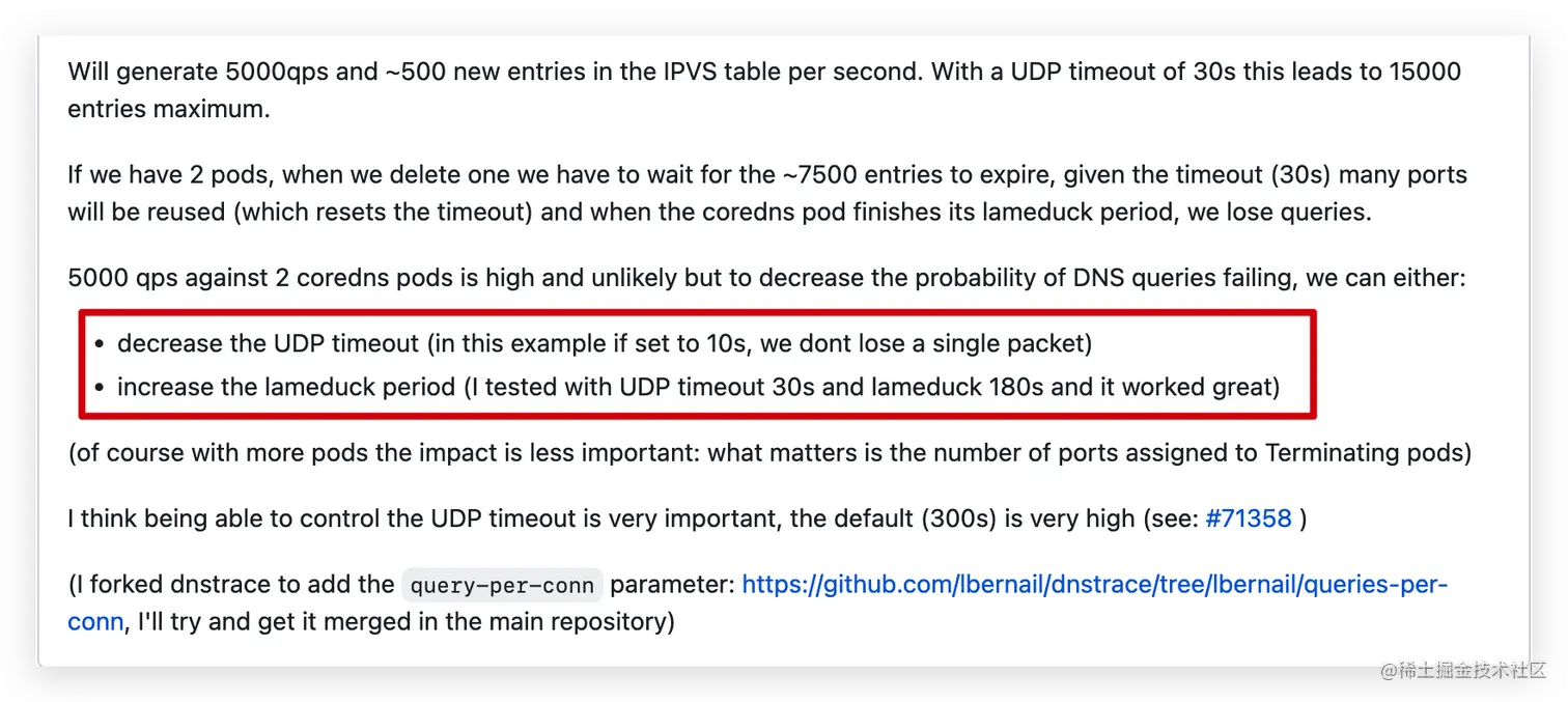 通过查阅 issue 得知,这里可能与ipvs_udp_timeout有关,默认的设置的是300s,coredns 滚动更新的时候 ipvs 中 udp 老链接会 300s 才删除,如果在 300s 内客户端有端口重用的话就会出现这个问题,并且这个时间和日志发生的时间也很类似,持续了5分钟。