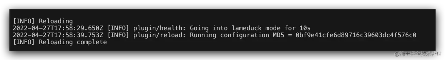修改 coredns configmap 后,coredns 会自动 Reload,Relaod 过程中打印输出的 lameduck 时间为 上次配置的时间