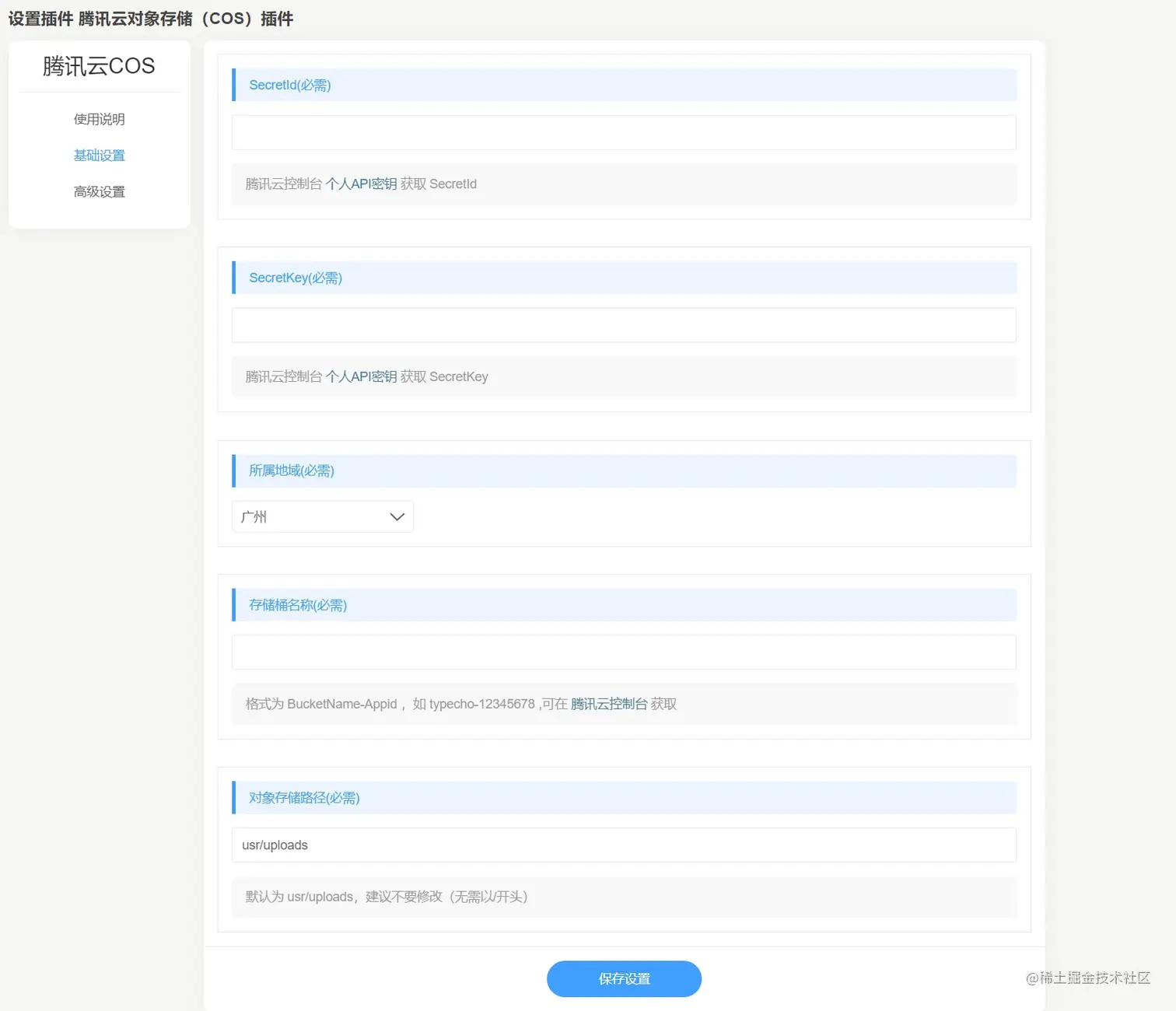 启用插件后,设置插件相关参数以便关联到 腾讯云COS,配置信息如下: