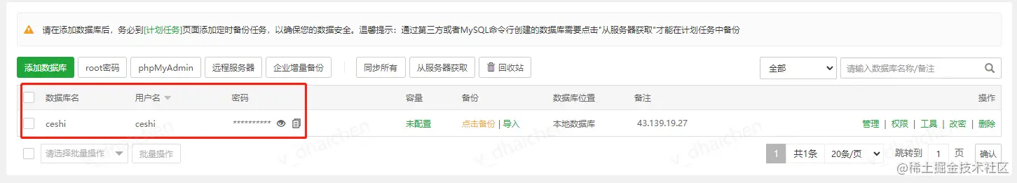 可在宝塔界面中获取数据库用户名、密码、名字。