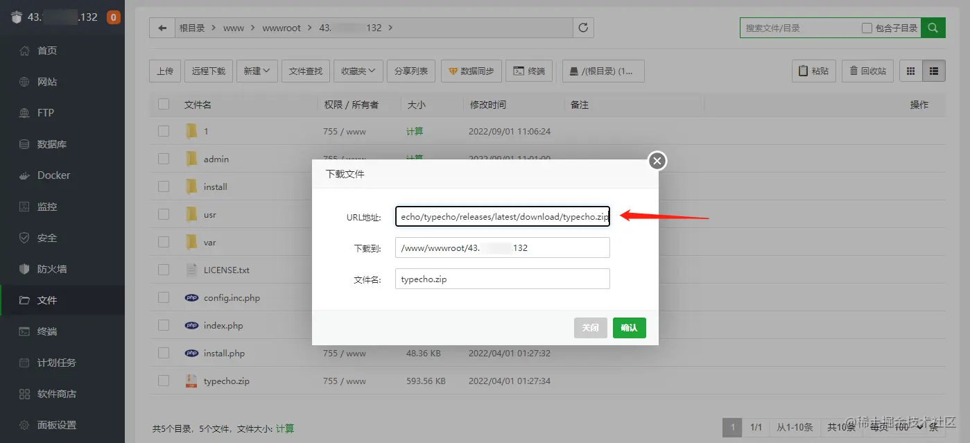 配置完成后,在宝塔 43.xxx.xxx.132 目录下单击远程下载,填入以下插件链接,然后得到该插件的压缩文件。