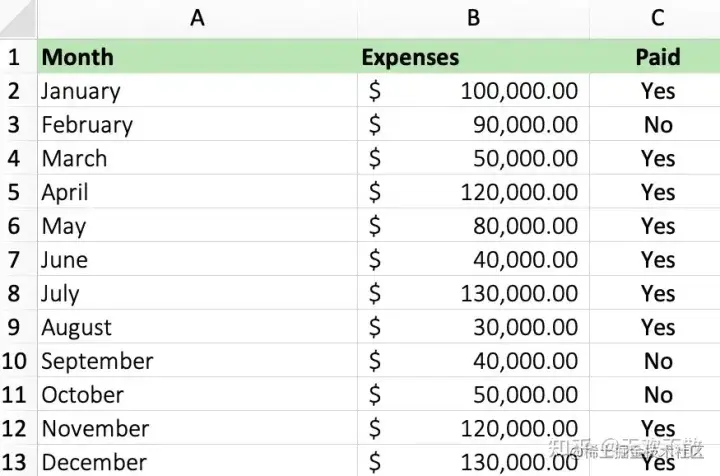 但是现在,我们用自然语言「告诉」ChatGPT 要计算的内容就可以了。我们以下面这张全年收入支出数据表为例,假设我们是 Excel 新手,不知道如何将 Expenses 列的值相加。