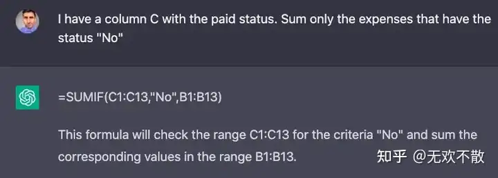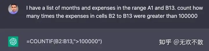 有时,我们对一个 Excel 表格有多个问题,这时我们也可以对 ChatGPT 连续提问。例如对于上面的收入支出数据表,想知道 1. 月支出超过 100000 美元的次数;2. 未支付的费用总计多少,我们就可以询问 ChatGPT 获得计算公式: