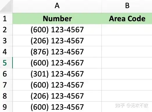 接下来挑战任务升级。假设我们有下面的电话号码列表,我们想要额外的区号(area code),即前面括号内容。