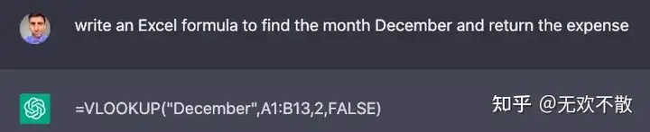 特别是对于一些复杂的函数,如果我们记不清其参数格式,就可以让 ChatGPT 帮忙写出正确格式,例如 VLOOKUP: