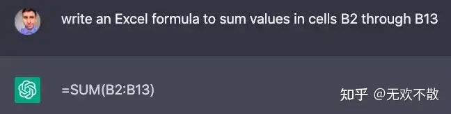 在这种情况下(当我们想要对一些数据进行求和),我们只需要告诉 ChatGPT 要对哪些数据求和,它就会输出一个已经代入实际参数的公式。例如: