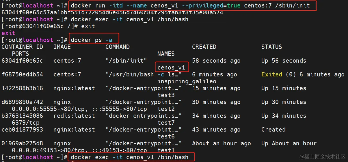 docker run -itd --name cenos_v1 --privileged=true centos:7 /sbin/init