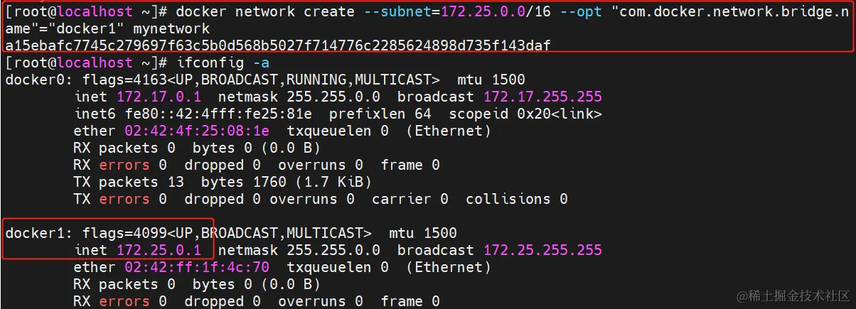 docker network create --subnet=172.25.0.0/16 --opt "com.docker.network.bridge.name"="docker1" mynetwork