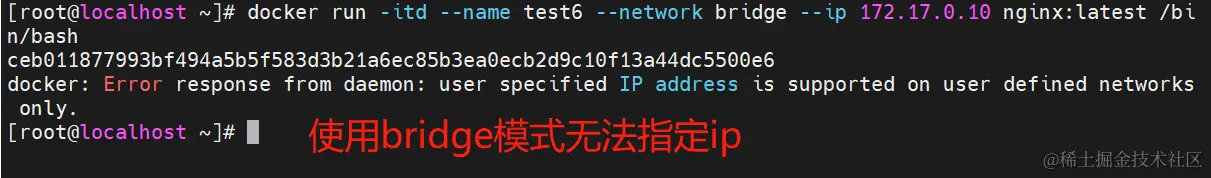docker run -itd --name test6 --network bridge --ip 172.17.0.10 nginx:latest /bin/bash