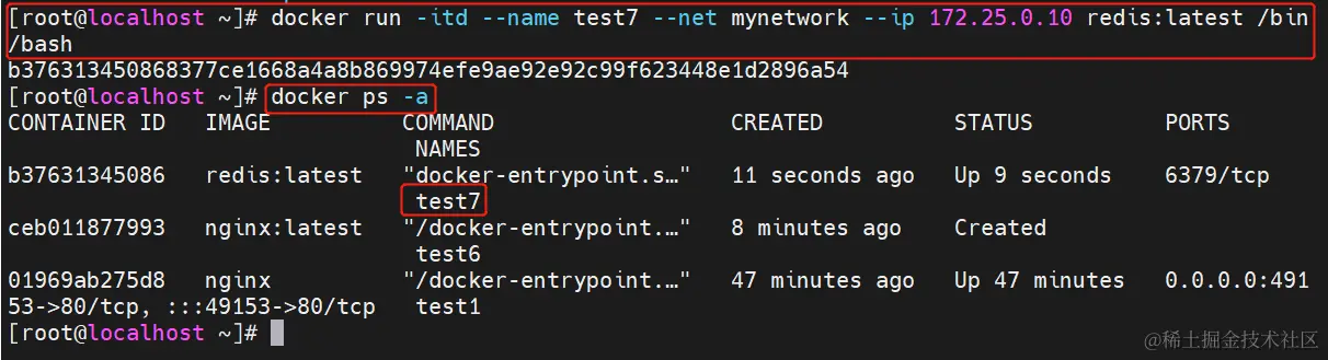 docker run -itd --name test7 --net mynetwork --ip 172.25.0.10 redis:latest /bin/bash