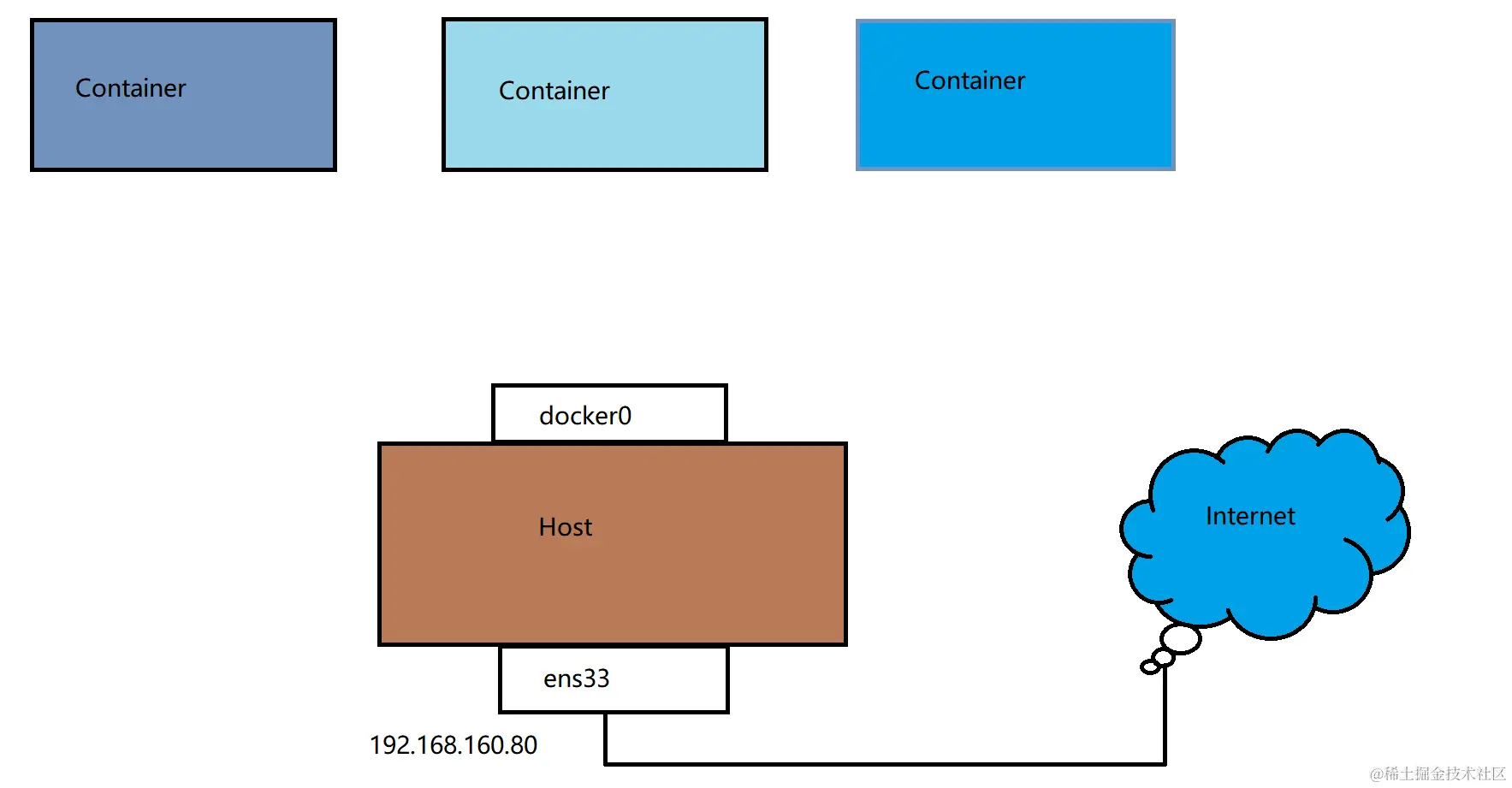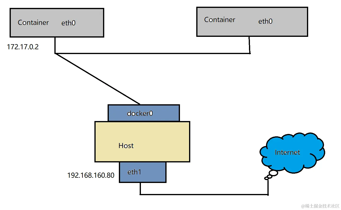 Docker使用Linux桥接,在宿主机虚拟一个Docker容器网桥(docker0),Docker启动一个容器时会根据Docker网桥的网段分配给容器一个IP地址,称为Container-IP, 同时Docker网桥是 每个容器的默认网关。