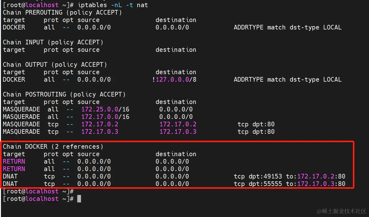 (4) 使用docker run -p时,docker 实际是在iptables做了DNAT规则,实现端口转发功能。可以使用iptables -t nat -nL查看。