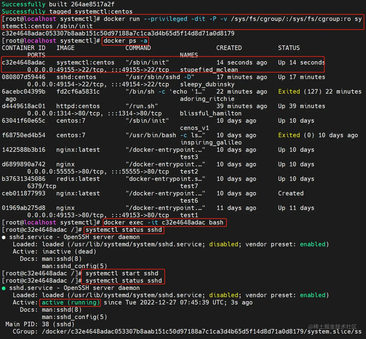 docker run -d -P --privileged sshd:centos /usr/sbin/init &
