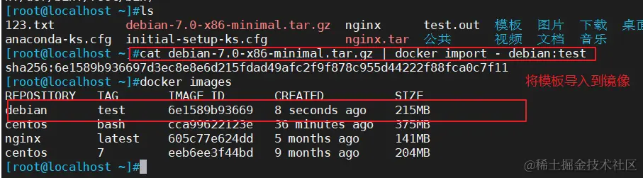 cat debian-7.0-x86-minimal.tar.gz | docker import - debian:test