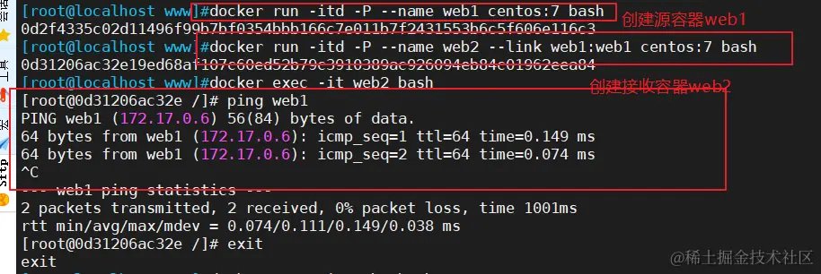 docker run -itd -P --name web2 --link web1:myweb1 centos:7 /bin/bash #--link容器名:连接的别名