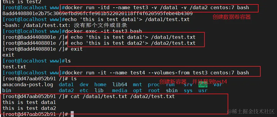 docker run -it --name test4 --volumes-from test3 centos:7 bash #创建并进入容器