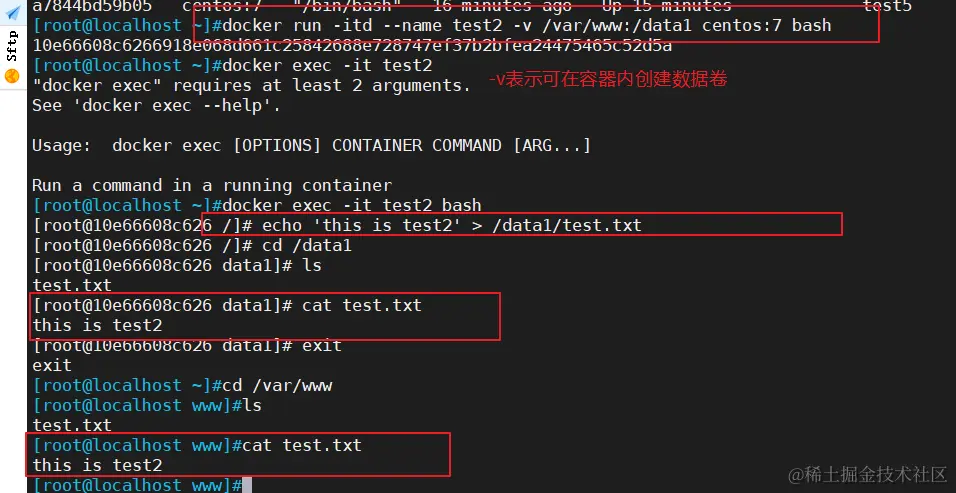 docker run -it --name test2 -v /var/www:/data1 centos:7 bash