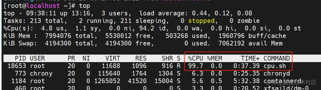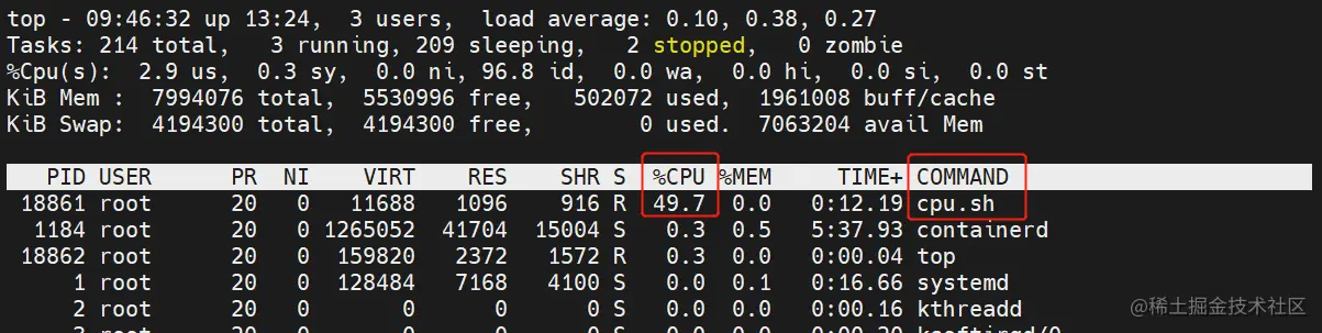 top #可以看到cpu占用率接近50%,cgroups对cpu的控制起了效果