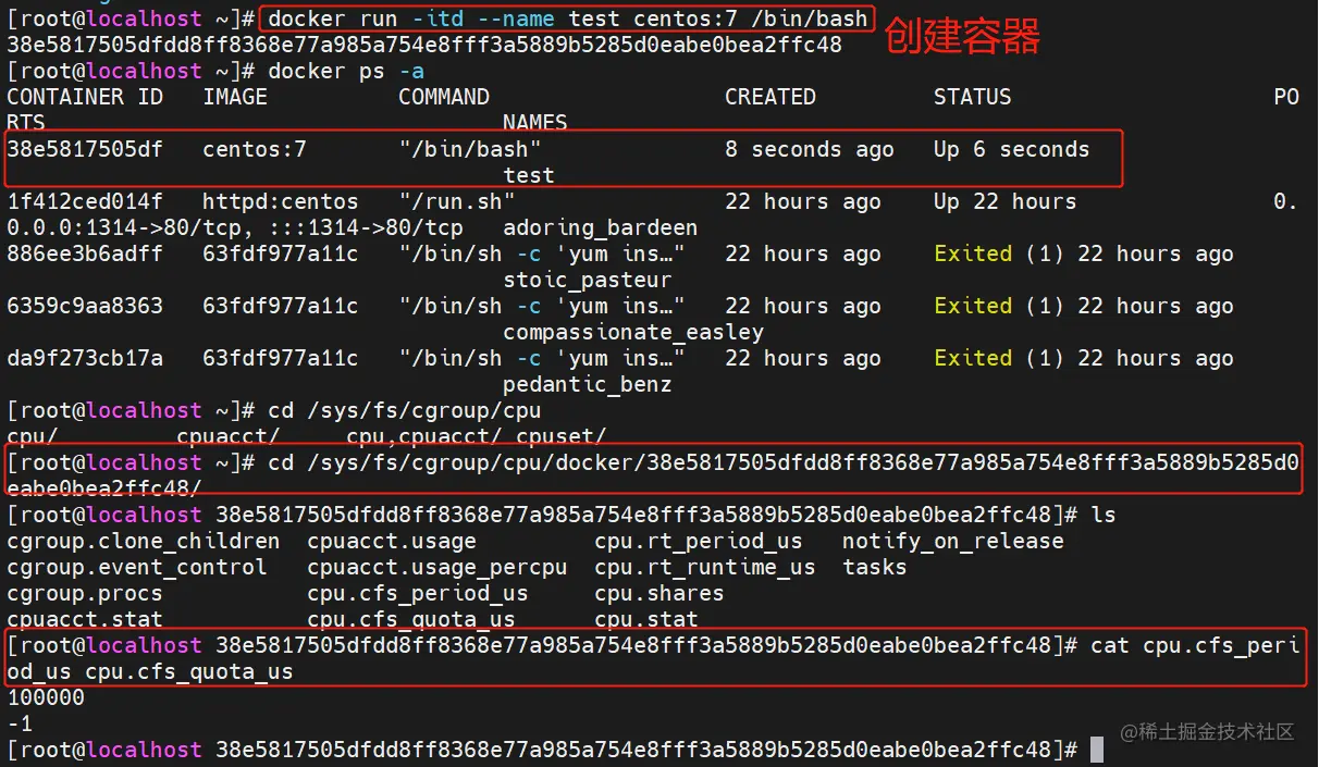 使用--cpu-period即可设置调度周期,使用--cpu-quota即可设置在每个周期内容器能使用的CPU时间。两者可以配合使用。