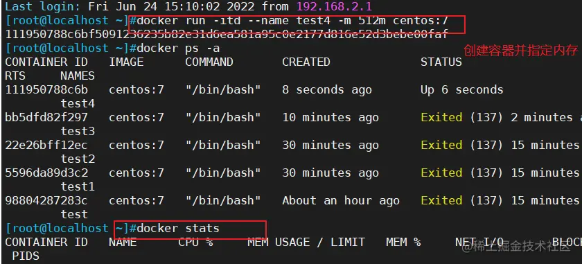 docker run -itd --name test4 -m 512m centos:7 /bin/bash