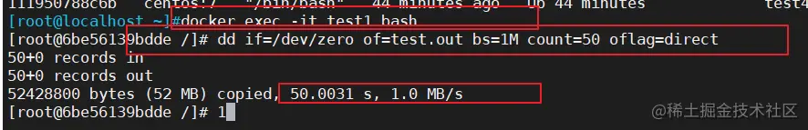 dd if=/dev/zero of=test.out bs=1M count=50 oflag=direct #添加oflag参数以规避掉文件系统cache