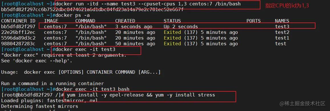 docker run -itd --name test2 --cpuset-cpus 1,3 centos:7 /bin/bash