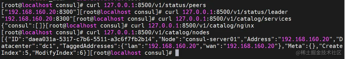 curl 127.0.0.1:8500/v1/catalog/nginx #查看 nginx 服务信息