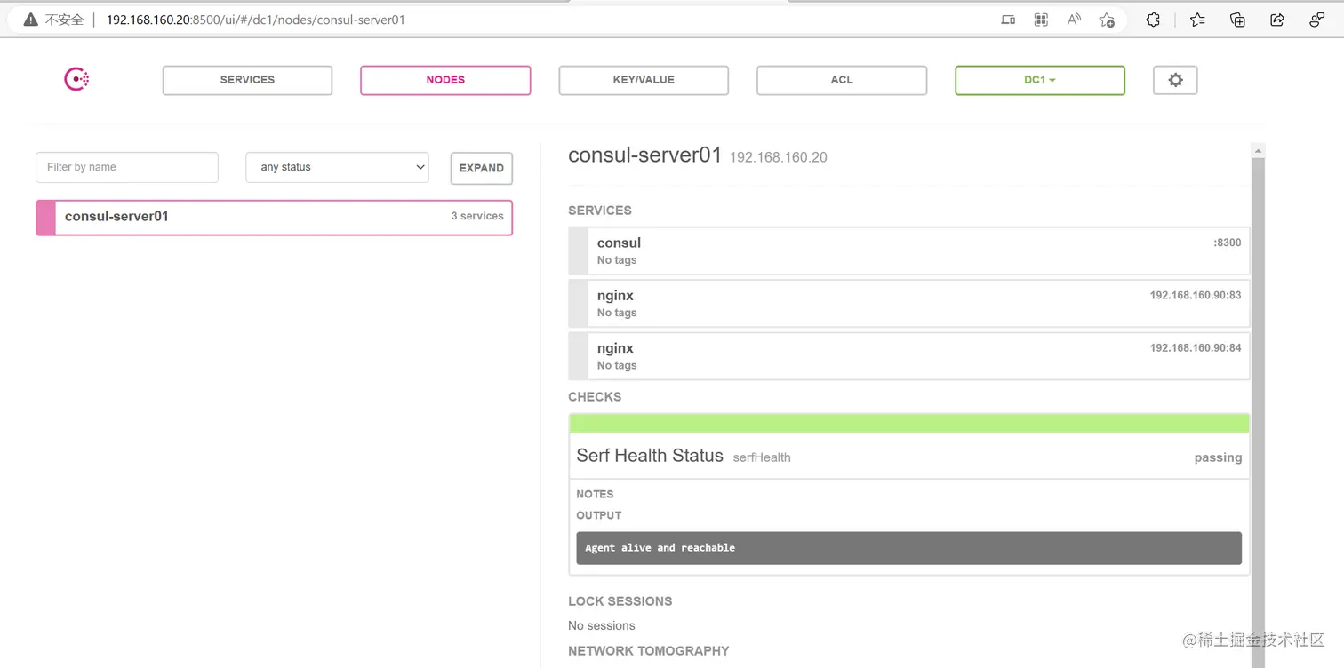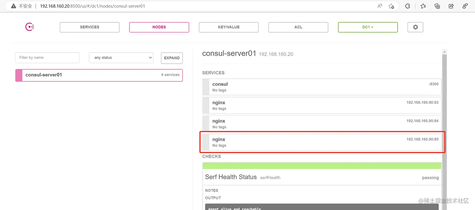 浏览器中,输入 http://192.168.160.20:8500,在 Web 页面中“单击 NODES”,然后单击“consurl-server01”,会出现6 个服务。