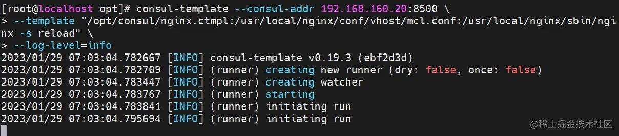 //在前台启动 template 服务,启动后不要按 ctrl+c 中止 consul-template 进程。