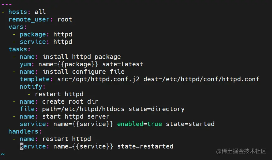 - name: restart httpd #notify和handlers中任务的名称必须一致