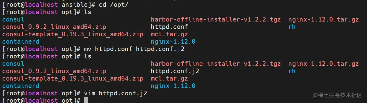 copy: src=/opt/httpd.conf dest=/etc/httpd/conf/httpd.conf #这里需要一个事先准备好的/opt/httpd.conf文件