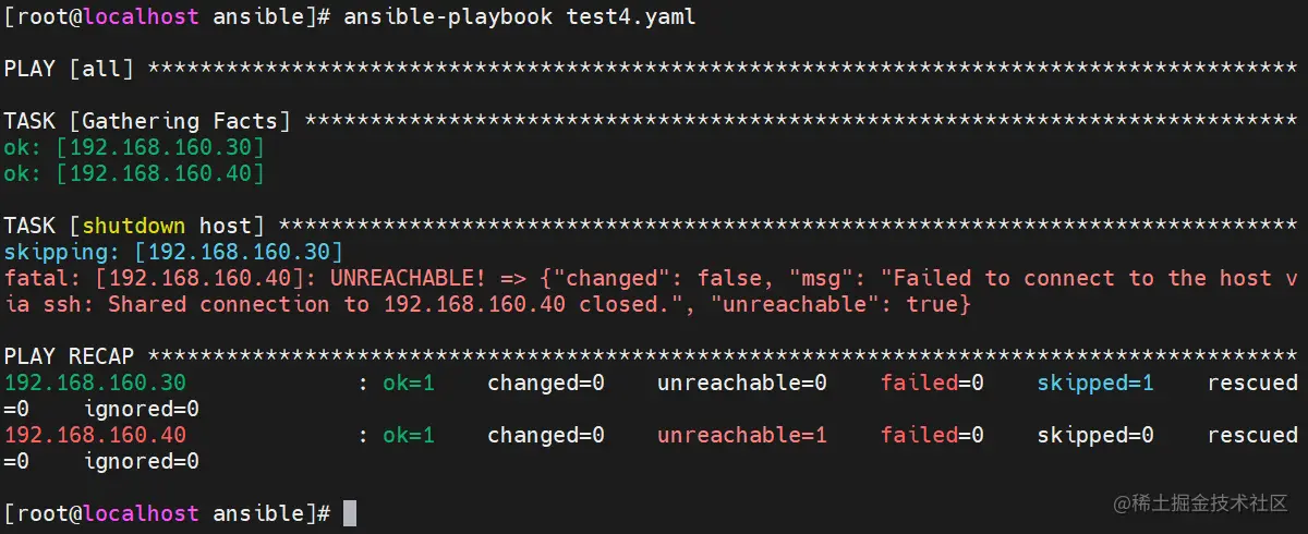 ignore_errors: True #如执行命令的返回值不为0,就会报错,tasks停止,可使用ignore_errors忽略失败的任务