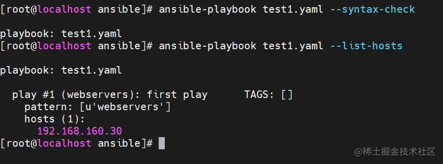 ansible-playbook test1.yaml --syntax-check #检查yaml文件的语法是否正确