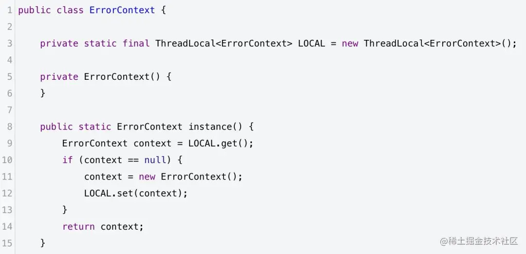 只是这里有个有趣的地方是,LOCAL的静态实例变量使用了ThreadLocal修饰,也就是说它属于每个线程各自的数据,而在instance()方法中,先获取本线程的该实例,如果没有就创建该线程独有的ErrorContext。