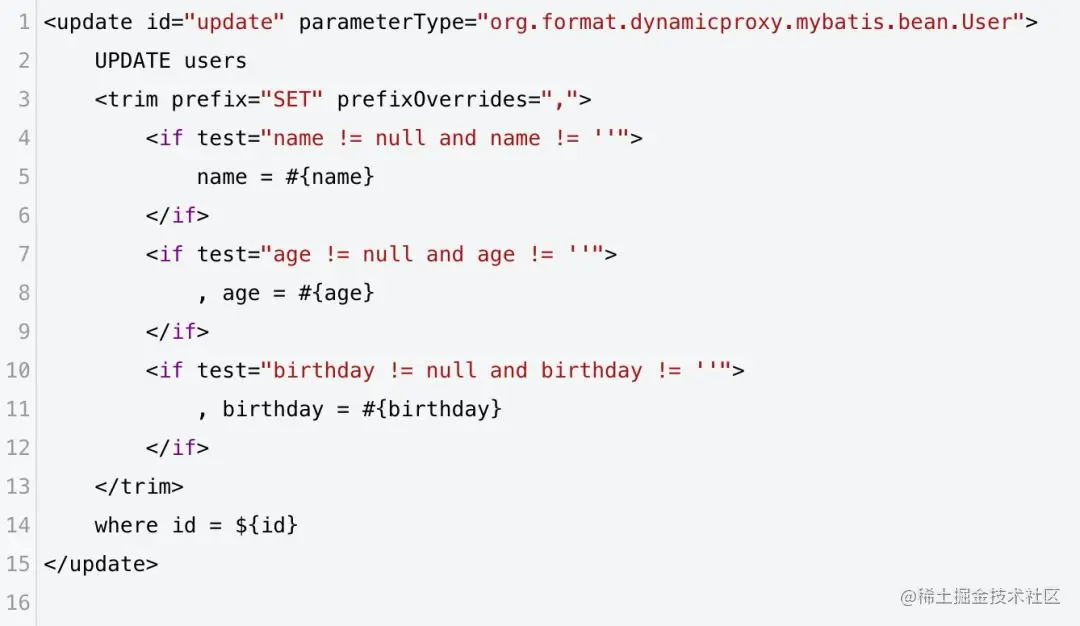 在这里面使用到了trim、if等动态元素,可以根据条件来生成不同情况下的SQL;