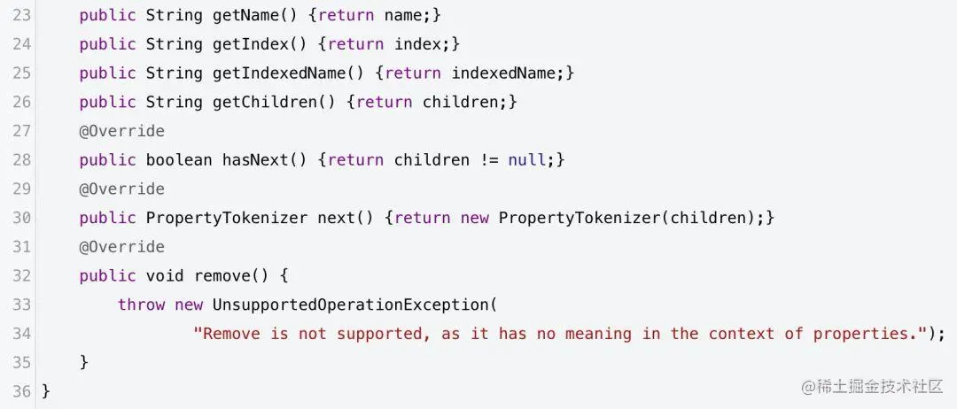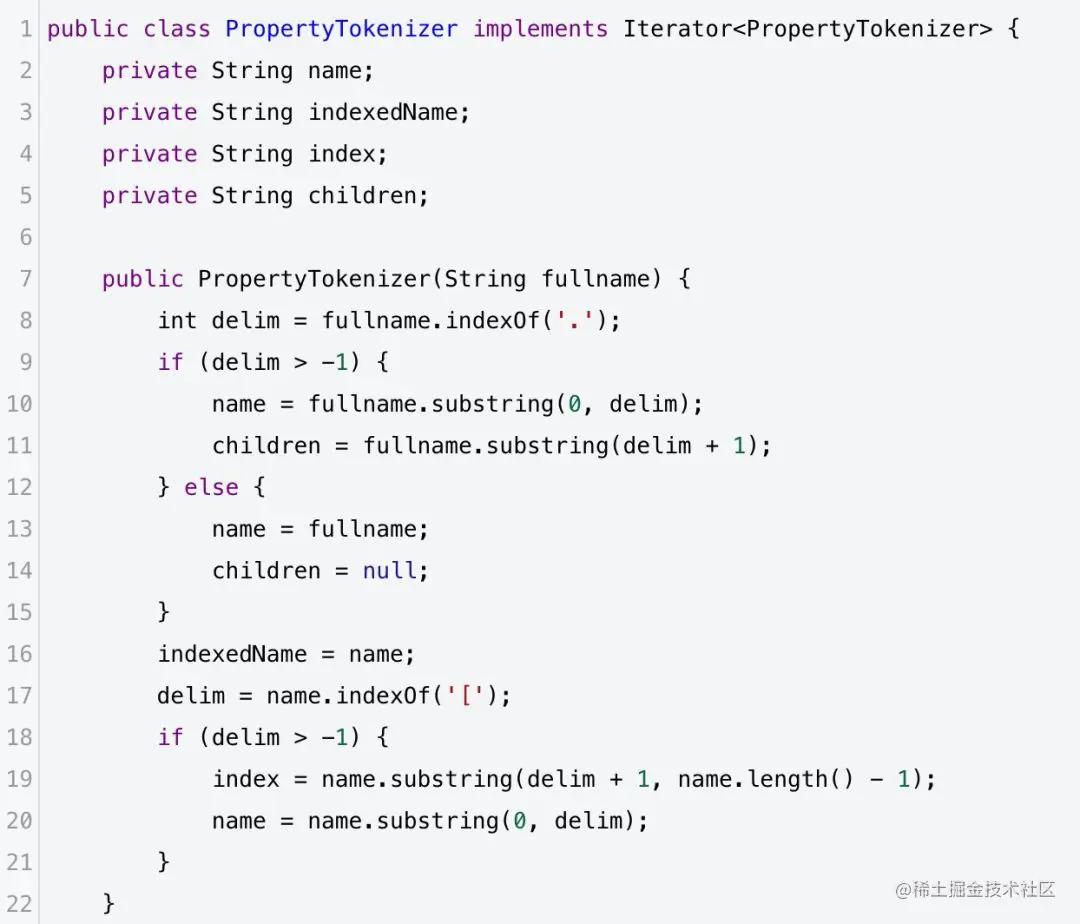 比如Mybatis的PropertyTokenizer是property包中的重量级类,该类会被reflection包中其他的类频繁的引用到。这个类实现了Iterator接口,在使用时经常被用到的是Iterator接口中的hasNext这个函数。