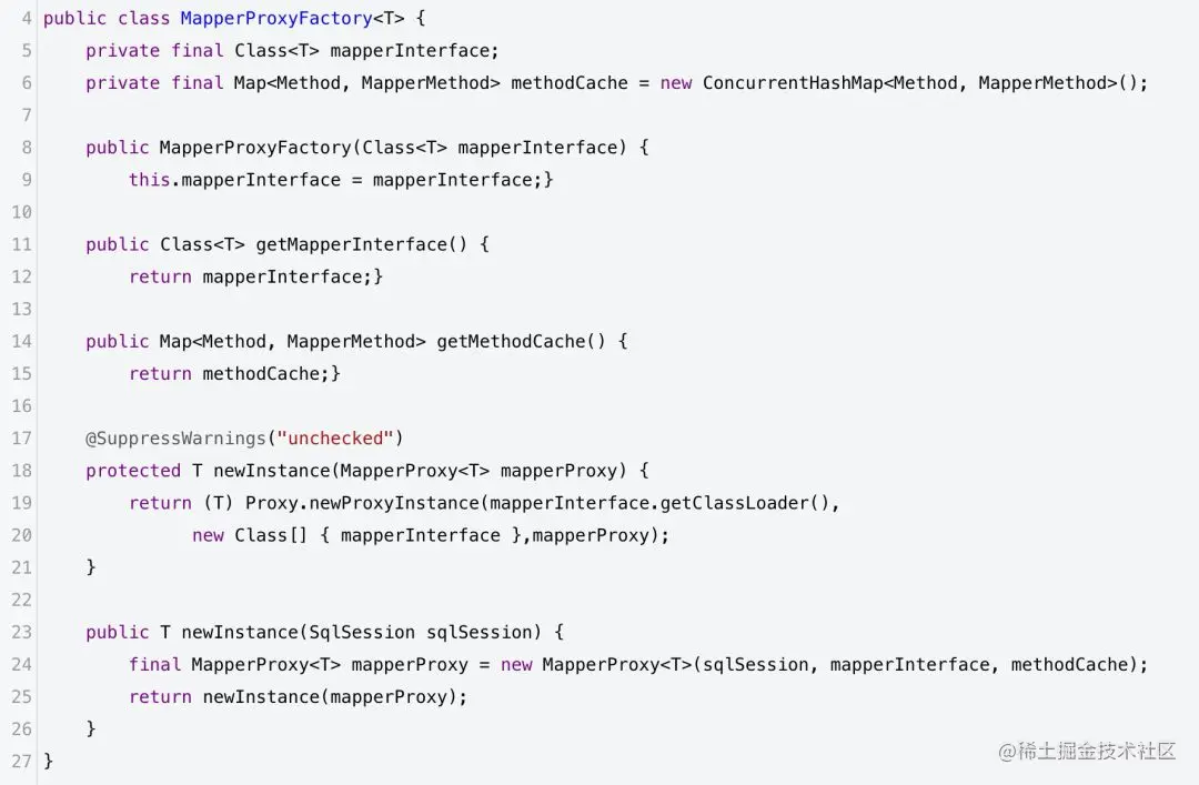 在这里,先通过T newInstance(SqlSession sqlSession)方法会得到一个MapperProxy对象,然后调用T newInstance(MapperProxymapperProxy)生成代理对象然后返回。