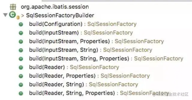 对于builder的具体类,方法都大都用build*开头,比如SqlSessionFactoryBuilder为例,它包含以下方法: