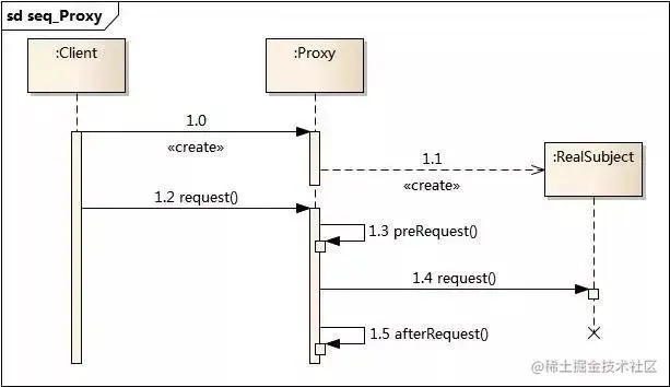 这里有两个步骤,第一个是提前创建一个Proxy,第二个是使用的时候会自动请求Proxy,然后由Proxy来执行具体事务;