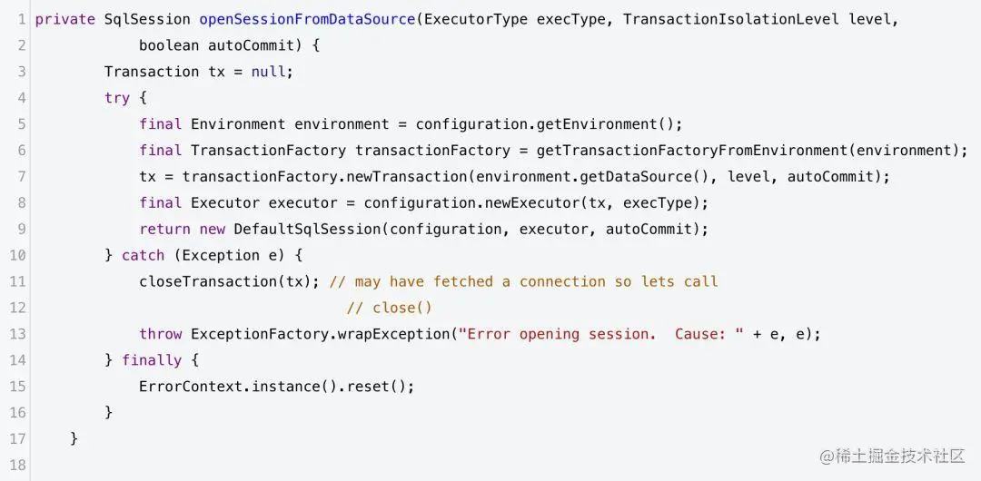 这是一个openSession调用的底层方法,该方法先从configuration读取对应的环境配置,然后初始化TransactionFactory获得一个Transaction对象