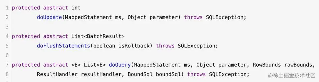其中的BaseExecutor就采用了模板方法模式,它实现了大部分的SQL执行逻辑,然后把以下几个方法交给子类定制化完成:
