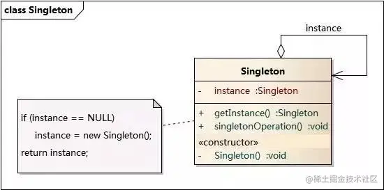 构造函数是private修饰,具有一个static的局部instance变量和一个获取instance变量的方法,在获取实例的方法中,先判断是否为空如果是的话就先创建,然后返回构造好的对象。