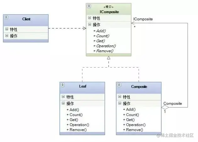 在使用组合模式中需要注意一点也是组合模式最关键的地方:叶子对象和组合对象实现相同的接口。这就是组合模式能够将叶子节点和对象节点进行一致处理的原因。