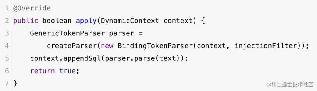 组合模式的简单之处在于,所有的子节点都是同一类节点,可以递归的向下执行,比如对于TextSqlNode,因为它是最底层的叶子节点,所以直接将对应的内容append到SQL语句中: