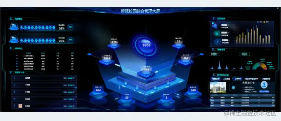 那除了左右的“33”,中间的“1”便是撑起整个大屏的关键。我们在大屏的中间可以放置相应的背景大图、3D模型、地图组件或者明细数据。不同的场景对应不同的展示风格,只需适当的切换就可以带来很大的反响。就比如上述第一个背景主要显示一些完成数据,并用图片撑起。而整个大屏展示的也是校内信息指标反应,这个结合就非常成功。
