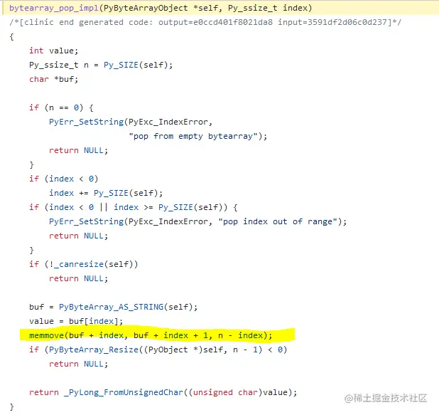 在这两种情况下,都会调用PyByteArray_Resize来调整大小。当新的大小小于分配大小的一半时,分配的内存将收缩。在del b[0]的情况下,只有这个时候数据才会被复制。因此,这种情况时间复杂度O(1)。