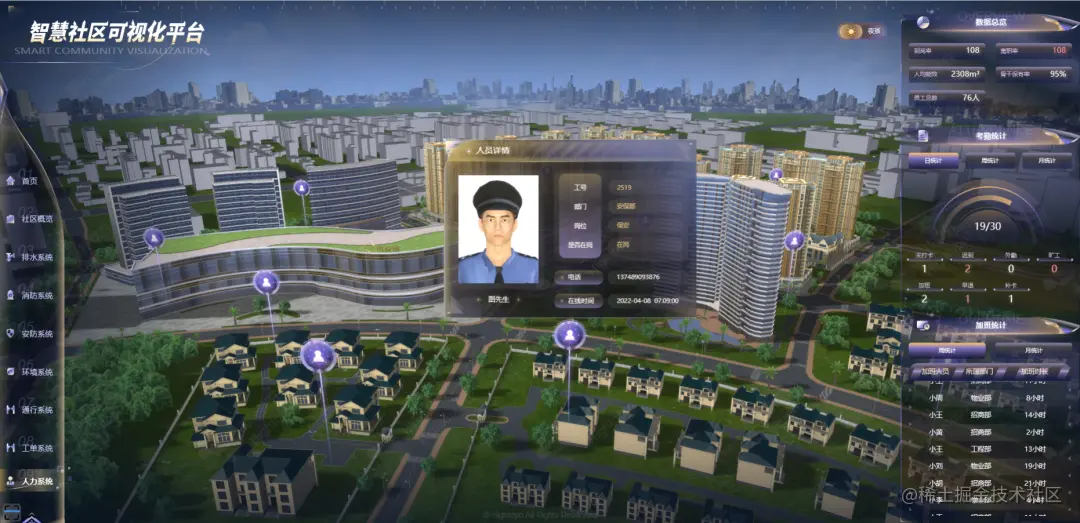 为打造信息共享、即时通信、数据可视的一体化社区管理体系。图扑软件(Hightopo)可视化平台归集人员基础、考勤、加班等监管要素进行综合性展示。结合 UWB 厘米级高精度人员定位技术,通过员工佩戴的定位工牌与可视化场景深度融合,依照 UWB 定位系统传输的定位坐标数据,在三维场景中实时呈现保安、运维、招商等物业服务人员定位信息。在能远程灵活安排员工作业调度的同时,也保障了人力信息的完整性、真实性和可追溯性。