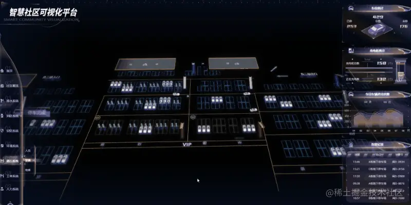 结合 2D 面板展示车位统计、新能源充电桩统计、车辆进出、告警记录等实时数据。让数字管理形式赋能社区停车管理工作更加流程化、制度化和全局化,为社区内停车管理作出决策支撑。