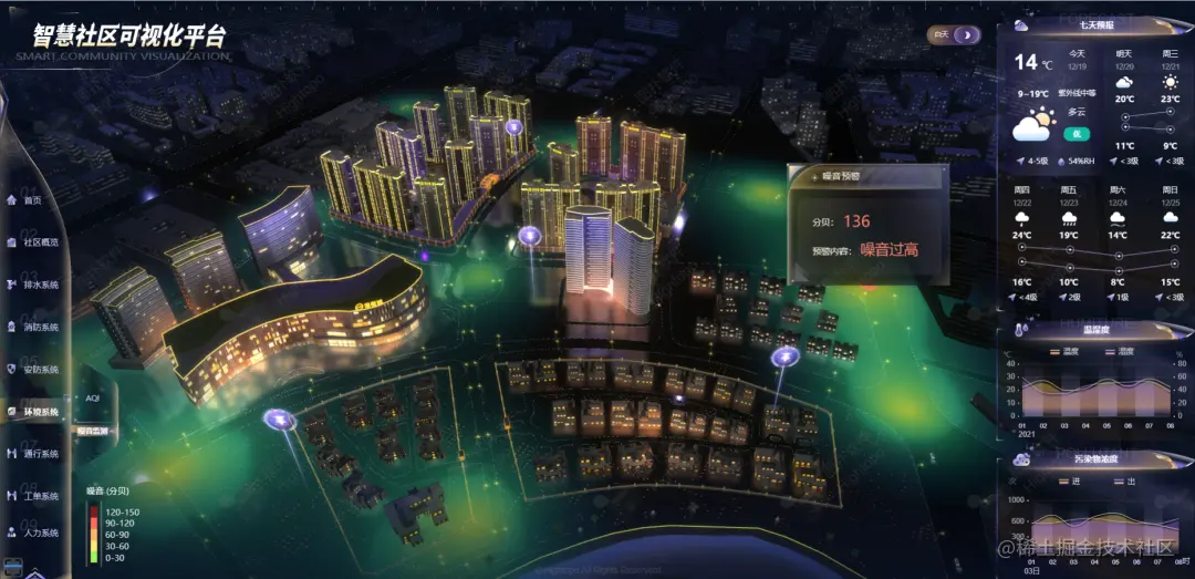 同时应用图扑 HT 强大的渲染引擎,将社区空气质量指数(Air Quality Index ,简称 AQI)、噪音监测情况渲染成热力图的形式进行展示。场景内将根据实时指数变化实现色阶的改变,以表示空气质量或噪音分贝,当指数超出正常范围时,系统会自动触发告警,定位至该区域,输出指数超标信息。三维可视化环境系统监测预警机制,提高了对大范围、碎片化社区的管理效率,更有质量的督促用户快速注意和快速维护。